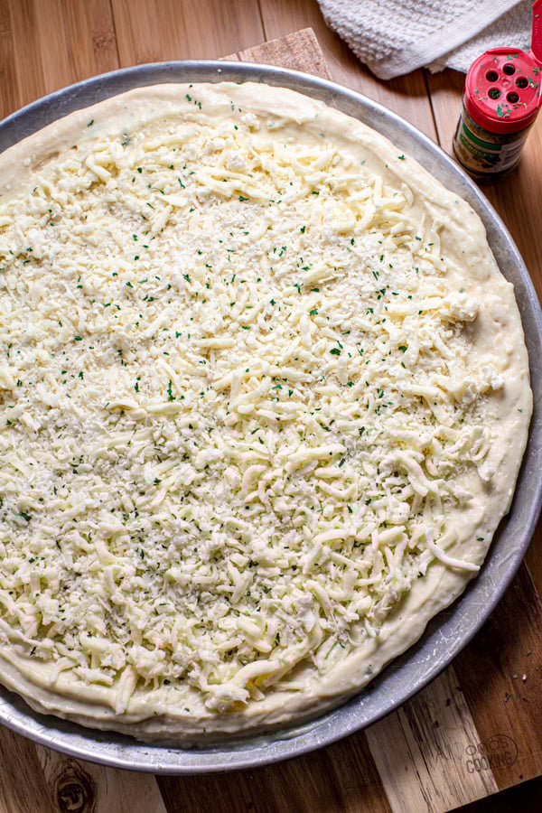 Grease is the secret to a golden brown crust! It also helps with the crispiness factor so oil up those pizza pans and edges! Since alfredo has cream (the ingredient that makes butter) it works like the grease factor here. So what I’d do is just smear the alfredo sauce all over the top including the edges, this way the crust browns beautifully without the addition of extra grease!