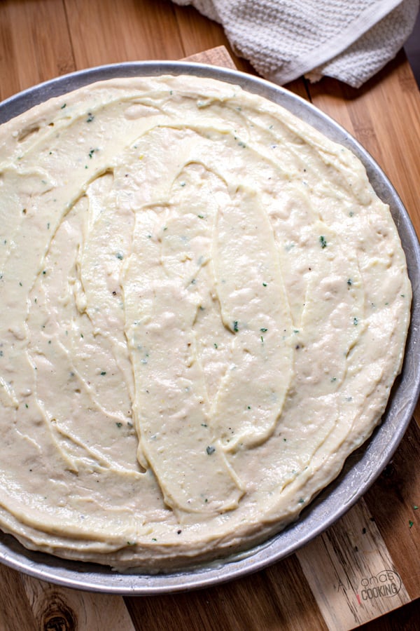 - Spread 1 cup of alfredo all over the top surface including the crust.