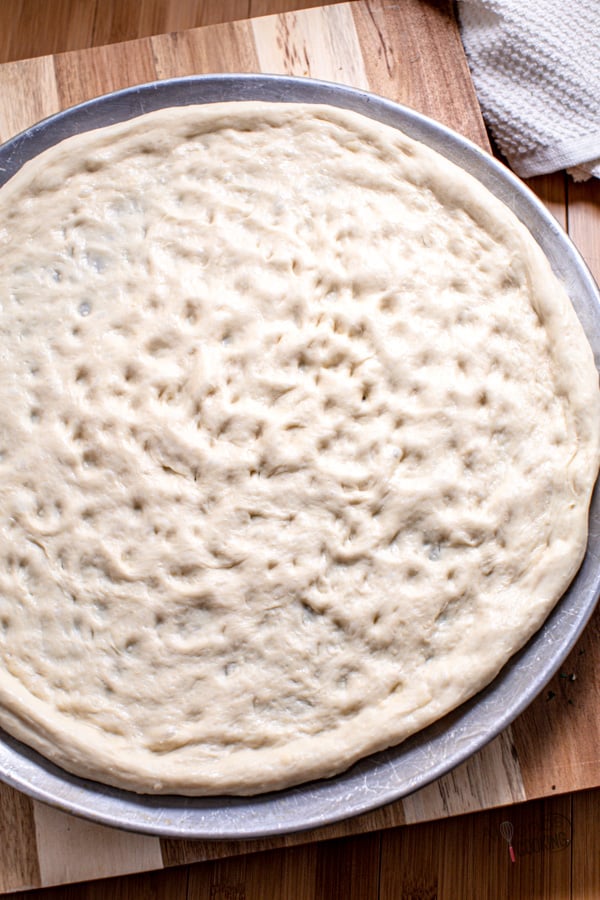 - Preheat oven 450°F. Grease two large pizza pans with 2 Tbsp of oil, each. Divide the pizza dough in half and form two 14" circles right inside the pizza pans. Indent the center with finger tips and slightly leave a thicker border for the crust.