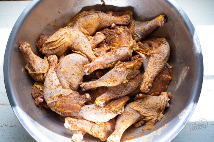 - In a large mixing bowl, sprinkle all the dry seasonings over the chicken leg quarters. Rubs spices into the meat and add the soy sauce. Toss everything together and marinate for at least 2 hours.