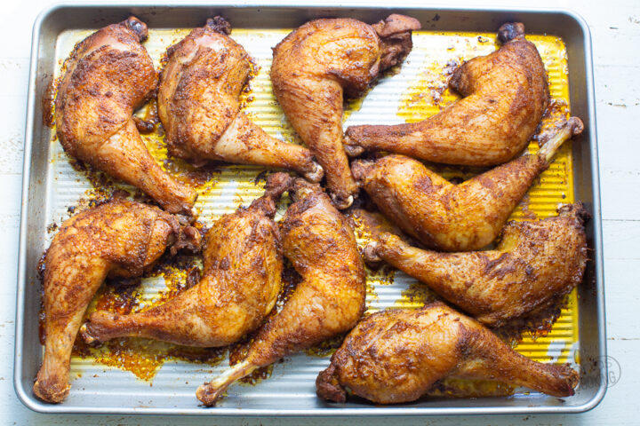 The key to crispy skin is baking the chicken without foil. The dry heat and hot air helps cook the chicken evenly so, there is no need to flip the chicken leg quarters when baking. Kind of like rotisserie chicken, you’ll need an open heat source if you want those skins crispy. For oven-roasting chicken leg quarters at home, you’ll only need a pan and some oil to crisp up the chicken.