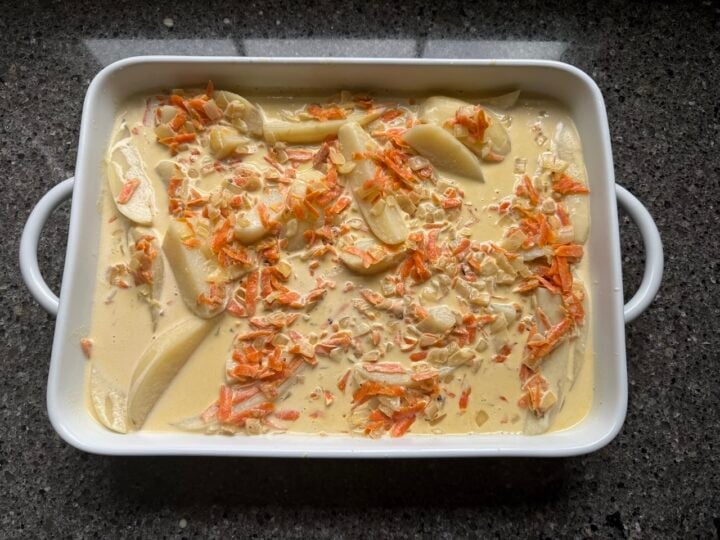 These baked potato wedges in a heavy cream sauce make a rich and comforting side dish. When baking potato wedges in a cream sauce they become tender on the inside while absorbing the flavors of the sauce. We add extra flavor and texture, by adding lots of carrots and onions (Ukrainian staples).