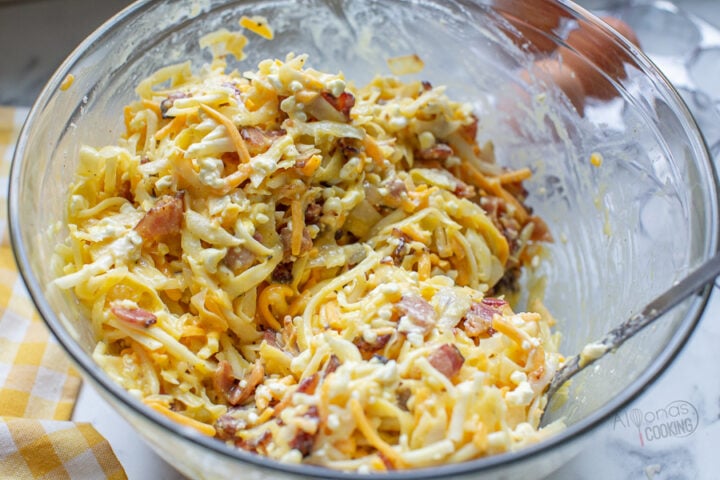 - Transfer the bacon mixture to a large mixing bowl. Add frozen hash browns (thaw if clumped up), beaten eggs, cheddar cheese, and cottage cheese. Mix well to coat all the ingredients in the eggs.