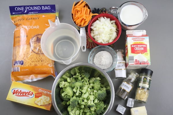 - Cheese Sauce—This recipe uses a roux of flour, water, chicken broth, and half-and-half. We use freshly grated cheddar cheese along with pasteurized cheese like Velveeta or American cheese slices for a velvety smooth soup. You can also use vegetable stock to make it vegetarian.