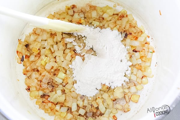 - In a large saucepan, sauté the onion in 3 tbsp of butter over medium heat until browned. Add the flour and stir until flour incorporates into the butter.