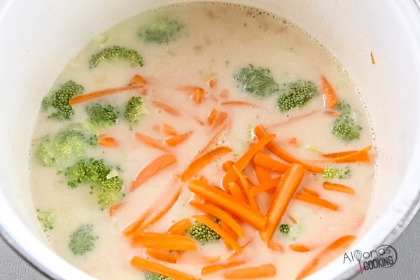 - Add the broth, water, and half-and-half, whisking until the mixture thickens (about 8 min.) Then add the broccoli and carrots and continue to simmer over medium-low heat until tender (10-15 minutes).