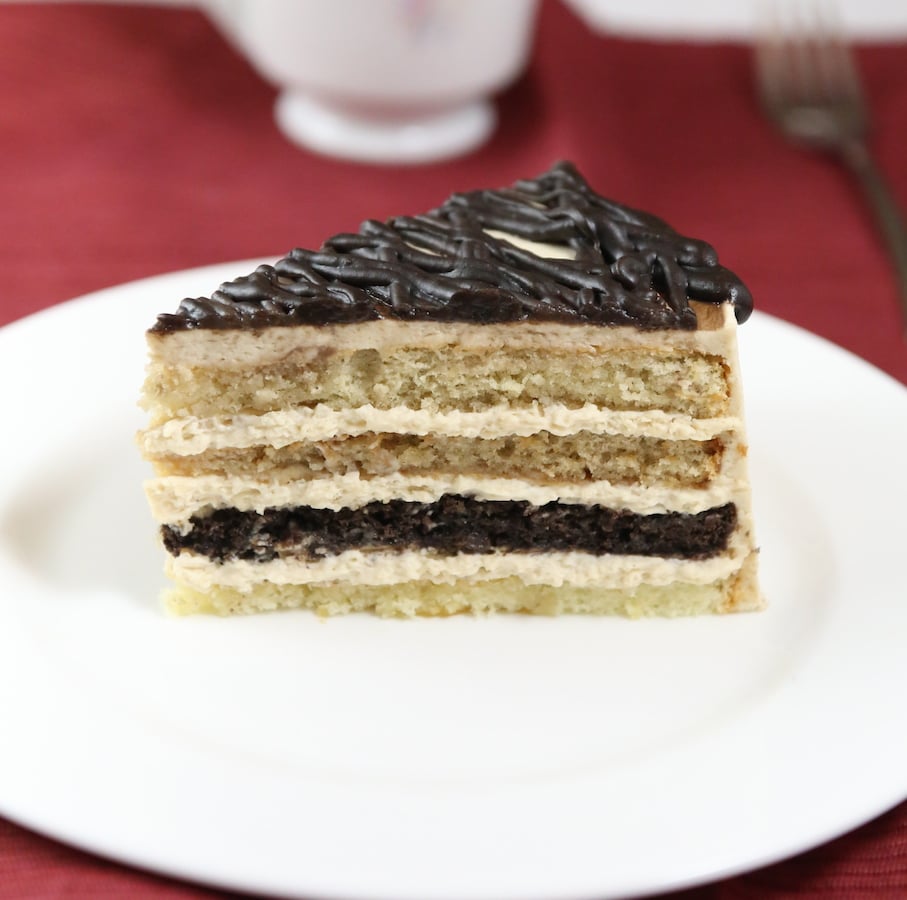 This Cappuccino Cake is so delicious! Four different layers are made from one batter and sandwiched between a mocha coffee cream mousse.