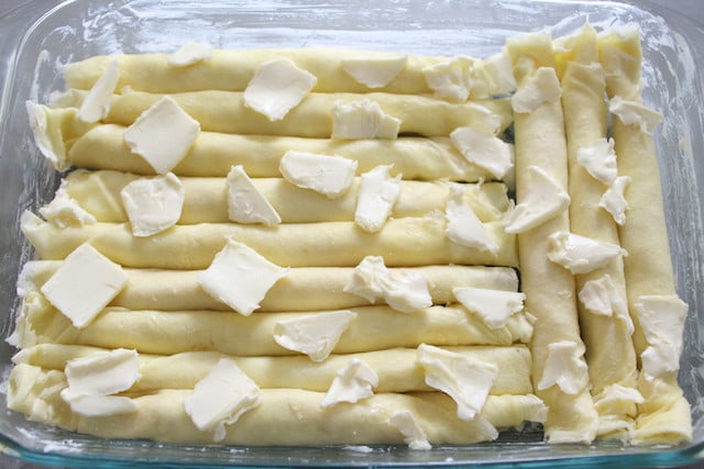 - Stack into a greased 9x13 pan and brush with a generous amount of melted butter between each layer. Cover and bake in a pre-heated 350°F oven for 25-30 minutes. Slice in half before serving.