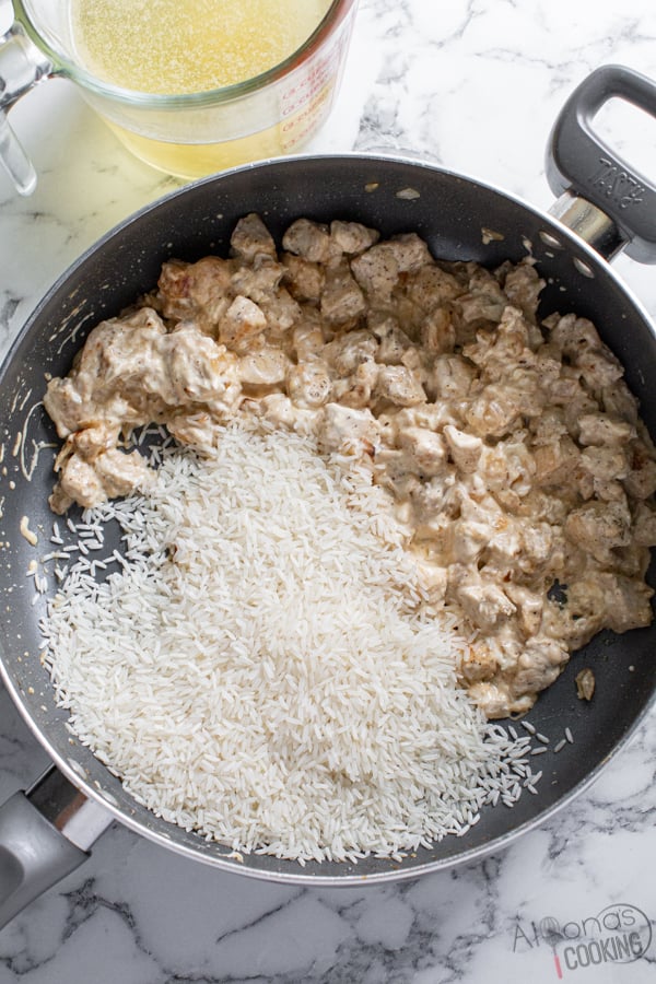 - Add the cream cheese and melt. Then stir in the rice and broth and bring to a boil. Simmer covered over low for 12 minutes.