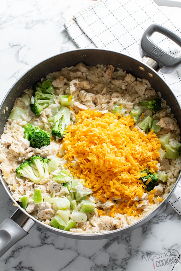 Either fresh broccoli florets or frozen broccoli can be used to make this cheesy chicken, broccoli, and rice recipe.