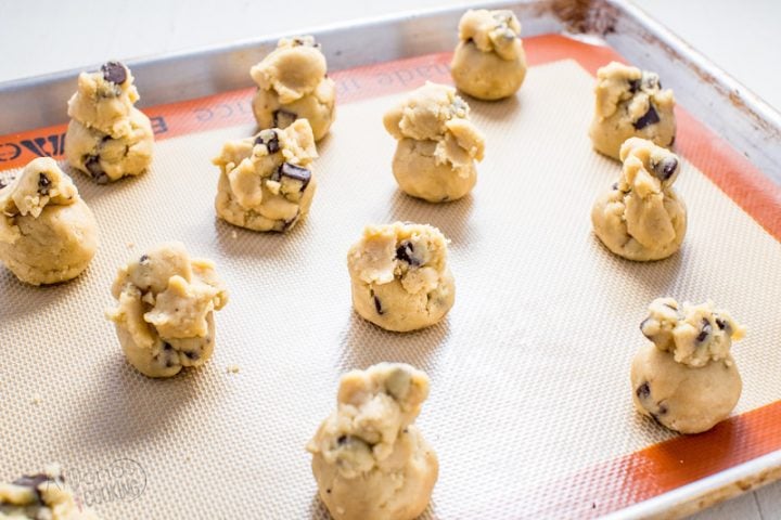 - For an extra chewy looking cookie pinch off a small piece of dough and place it right on top of the rolled balls of dough. The layers melt together and create a super chewy cookie. This is also how I made the cookies in these photos.