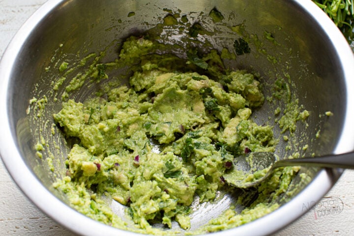 - Mash the avocados with salt and citrus juices.