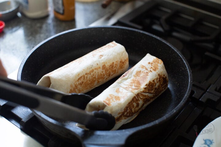 Before you start wrapping the burritos you’ll need to preheat a griddle or non-stick skillet. To speed up the toasting time I sometimes microwave the burritos with toppings for 30 seconds, then remove, wrap up, and toast. This makes the flour tortillas more pliable and gives a head start to grilling.