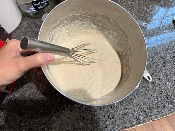 - In the bowl of a stand mixer, make the sponge by whisking together 3 cups of warm water, 2 Tbsp yeast, 1/3 cup of instant mashed potato flakes, and 3 cups of bread flour. Let that sit for 20 minutes, covered.