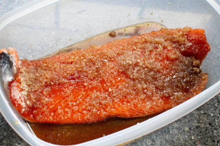 This process slows down if you just put it in the fridge right away, but I typically leave it in the brine at room temperature for 4-5 hours before storing it in the fridge. However, this is totally optional and if you feel hesitant, just put the salmon immediately in the fridge, the liquid will still draw out.