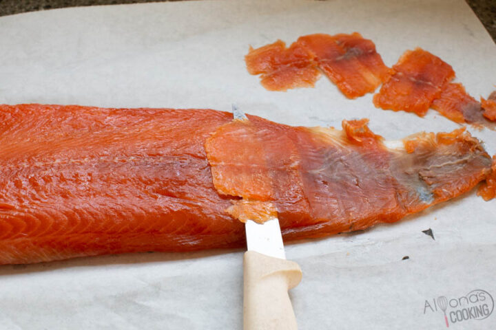 - Place salmon on a large sheet of parchment paper and using a very sharp knife, position the blade at a straight angle and move the blade to the right carving thin salmon slices.