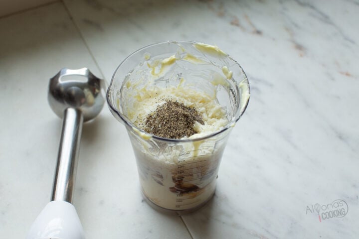 - Measure out the mayonnaise and place into the cup attachment of an immersion blender. You could use a bowl and whisk (see notes below).
