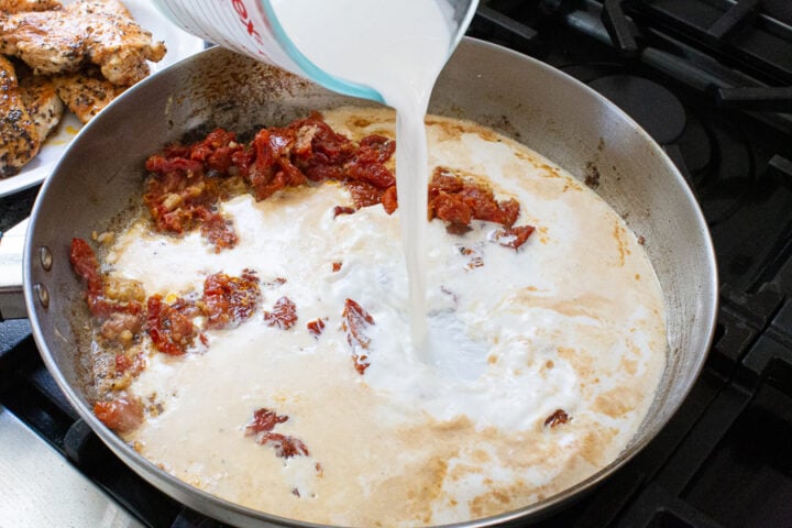 If you have never cooked with sundried tomatoes, they’re pickled and marinated tomato halves with a slightly tart aftertaste. Adding them into a chicken dish enhances the flavor by 10X and in my opinion, adds the oomph way more than using roasted peppers. If you want to go for a lighter cream sauce, use fresh red bell peppers and omit the sun-dried tomatoes (the orange hue mostly comes from the marinated sun-dried tomatoes and their oil.)