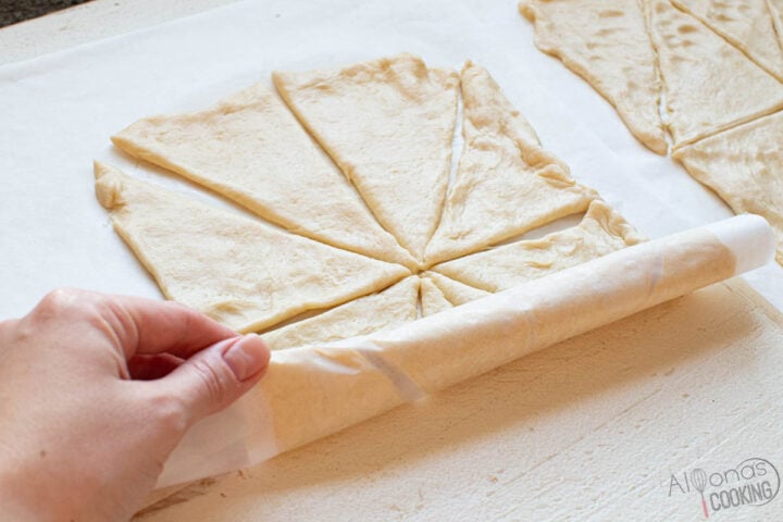 - Divide the dough into two equal parts and roll out each piece to a 12x8 rectangle over parchment paper. Using a bench scraper cut each rectangle into 4 then each piece in half diagonally to make 8 triangles.