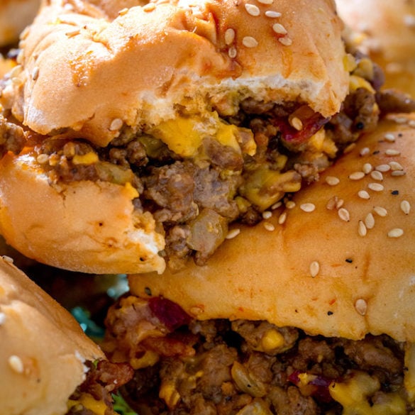Call it lazy cheeseburgers if you want because these involve very little effort to assemble. Kinda like sloppy Joes but cheeseburger tasting! These have bits of bacon in it but that can totally be omitted. And if you haven’t discovered my freezer bacon recipe, then are you missing out on a super-easy way to have ready bacon! They can be popped into the oven during the time you put your groceries away and you’ll have ready-to-freeze bacon that can be used ANY time you’ll need it! It reheats FAST and can be such a time saver! Make these EASY cheeseburger sliders with or without bacon and get prepared…It may be hard to stop at just one!