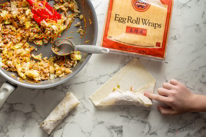 Wrapping an egg roll is as easy as folding in some sides and rolling it up!