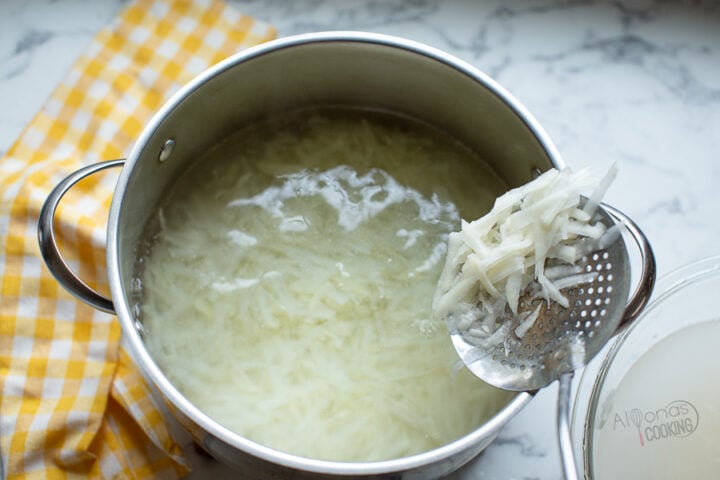 - Meanwhile, bring 2 quarts of water to a boil. Add grated potatoes using a slotted spoon, and discard the water it was soaking in. Blanch potato shreds for 2-4 minutes.