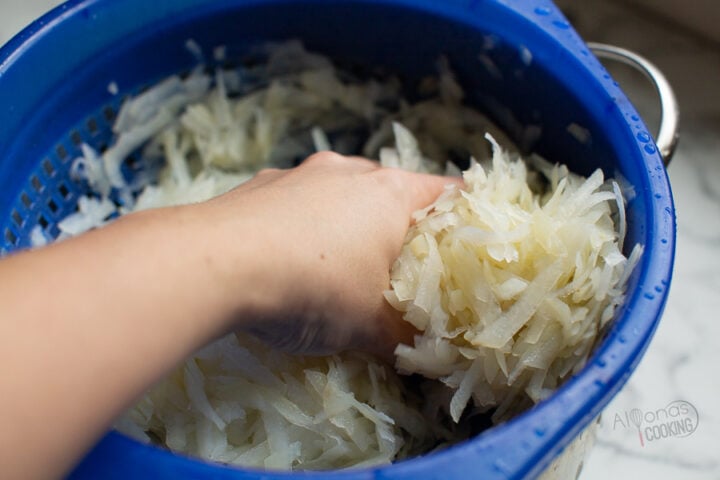 - Keep the potato shreds submerged under cold water until blanching in a pot. I’ll keep them in a large bowl they were shredded in. The potatoes can oxidize and turn brown if not covered in water.