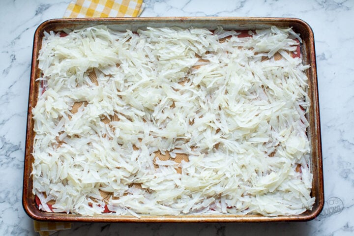 - Arrange shredded potatoes onto a large 18x13 sheet pan. Bake at 350°F for 10 minutes to dry out and remove excess moisture. Cool for 15 minutes in the pans.