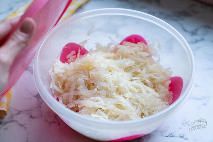 - Shred the potatoes into a large bowl using a box grater. Fill up with cold water to prevent it from oxidizing.
