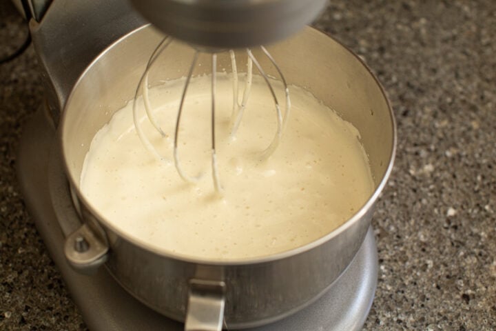 - In the bowl of a stand mixer, beat the eggs and sugar over high speed for 20 minutes. Meanwhile preheat the oven to 350°F and line two jelly roll pans with foil, lightly grease, and set aside.