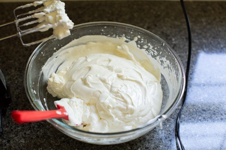 - Make the Sour cream Frosting: whisk together the sour cream and powdered sugar then set aside. In another bowl, beat the heavy cream to soft peaks and mix it into the sour cream mixture.