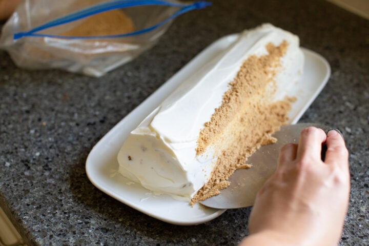 - Finish frosting the sides and top with 1/4 of the cream, and garnish with graham cracker crumbs if desired. Repeat process with the other cake roll. Serve immediately or keep in the refrigerator until needed.