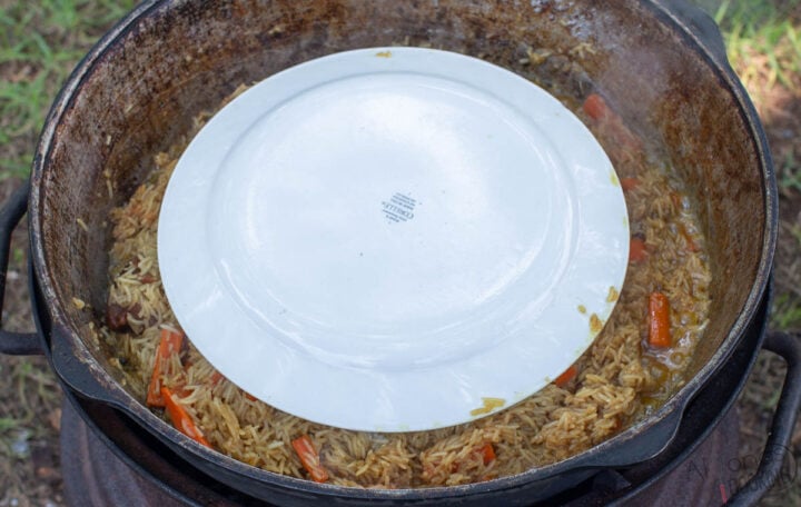 - Place a dinner plate over the top and cover the Kazan with the lid. Simmer over low for 45 minutes. Allow the fire to die out and don't open the Kazan. Serve with Shakarob (a tomato and onion salad.)