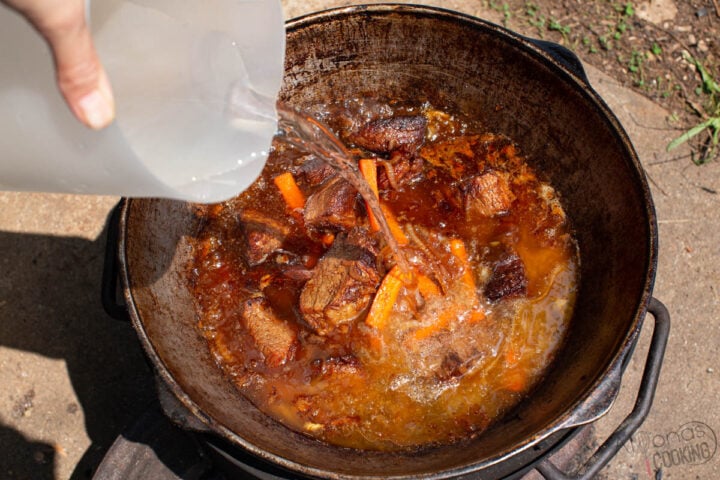 - To begin, heat the Kazan over high heat. This can be made over a propane cooking stove. Fry the meat for about 20 minutes, stirring occasionally. You want to cut the meat into large chunks.