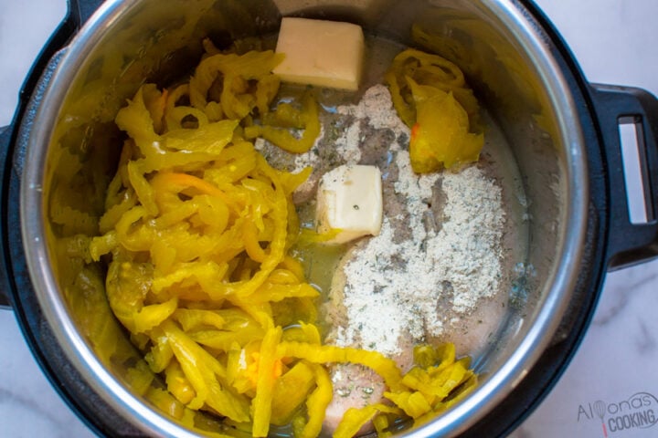 - Pour 1 cup of water onto the bottom of an instant pot. Add the chicken breasts, ranch mix, banana peppers and butter. Close the lid and seal the vent.