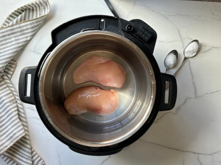 - Place 2 cups of water (or broth), two chicken breasts, and 2 tsp salt into the instant pot. Set on manual high pressure for 20 minutes. Once it's done cooking, depressurize it immediately (it takes about 10 minutes).
