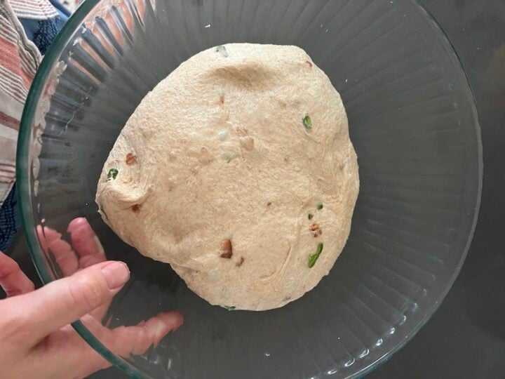 - Add the water, sourdough starter, honey, freshly milled flour, chopped jalapenos, 1/4 cup cheddar cheese, and bacon with the grease to a stand mixer. Knead for 15-20 minutes until the dough is smooth and no longer sticks to the sides. Add the salt and continue to knead for five more minutes.