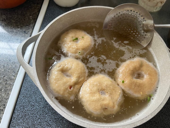 - Boil the bagels—Preheat the oven to 400°F. Meanwhile, I fill my pot with 3-4 quarts of water and bring it to a boil. Then, I add 1 T each of baking soda and brown sugar. Drop the bagels in and cook for 30-40 seconds on each side. Remove the bagels with a slotted spoon and place them on a silicone-lined baking sheet.