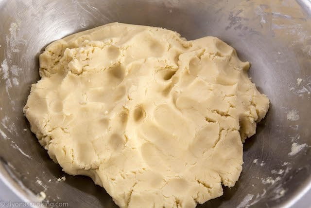 - In a large bowl beat the butter and sugar. Add in the eggs, mayo, baking soda mixture and cornstarch. Slowly beat in the flour and finish kneading the dough by hand until a thick dough forms.