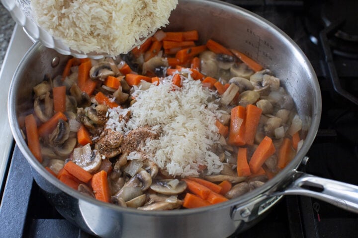Long-grain rice like basmati or jasmine rice is the kind of rice you’ll want to use here. Since long-grain rice remains more intact it tends to create individual grains whereas medium or short-grain rice is stickier after cooking. You can also convert this into brown rice with mushrooms by simply cooking it longer. You can often find Brown Basmati Rice at Azure Standard or Aldi for a healthier option.