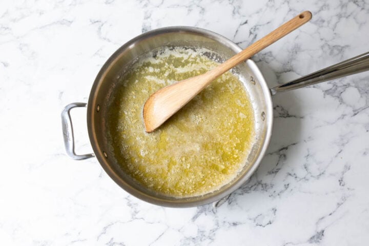 - Melt 4 oz of butter in a deep 10-inch skillet over medium heat. Add 1 teaspoon of chopped garlic and sweat it until aromatic (30 seconds).
