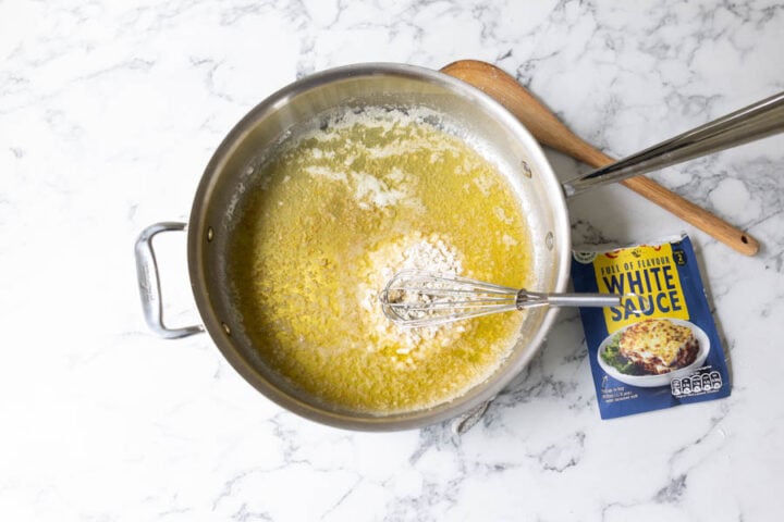 - Add the packet of dry white sauce* and whisk until no lumps remain.