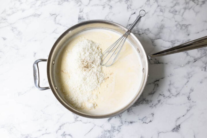 - Stir in 2 fluid oz of milk and 2 cups of heavy cream. Heat until it's steaming hot but not boiling. Whisk in the Parmesan cheese, salt, and pepper.