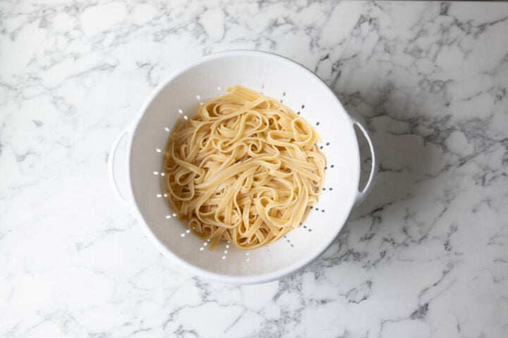 - Cook 1 pound of long pasta per the package instructions until al dente. Drain in a colander and rinse with cold water. Set aside.