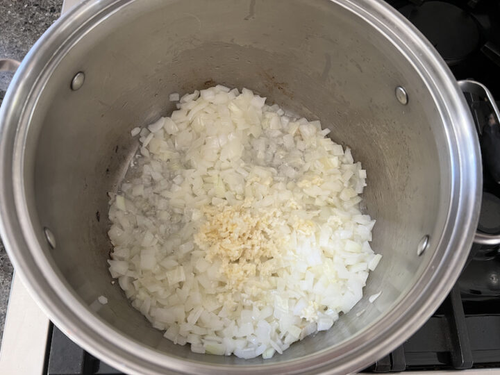 - In a large pot, heat the oil over medium heat. Sauté the onions until translucent (5 minutes.) Then add the garlic and cook until fragrant (1-2 minutes.)