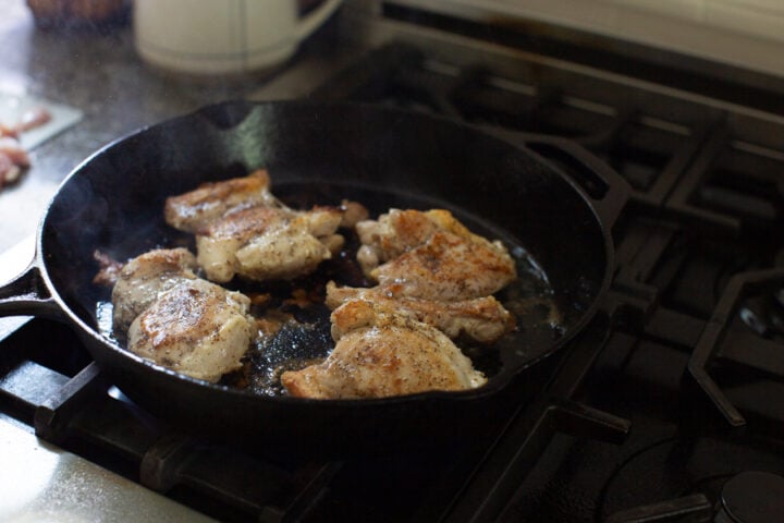 - In a large skillet brown chicken thighs over medium-high heat. Set aside.