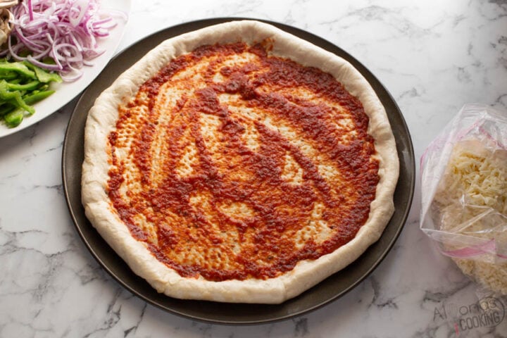 - Spread the pizza with marinara sauce and top with the pizza toppings.