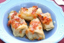 These potato-filled cabbage rolls are different from what you may recognize as traditional golubsti. They’re like Russian potato pancakes (Deruny) wrapped in cabbage leaves. No frying the potato filling though, the potato mixture thickens up during the baking resembling the texture of a Russian pancake. It’s not a new invention…