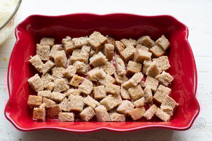 - Meanwhile, cut bread slices into 1/2-inch cubes. Spread over a 10×6 baking dish.
