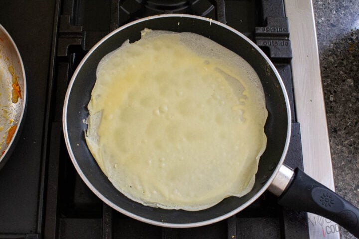 - Ladle a scant 1/3 cup of crepe batter directly in the pan and quickly swirl around to coat the bottom of the skillet. Cook for a minute or until the edges crisp up. Flip and continue to cook for 30 seconds.
